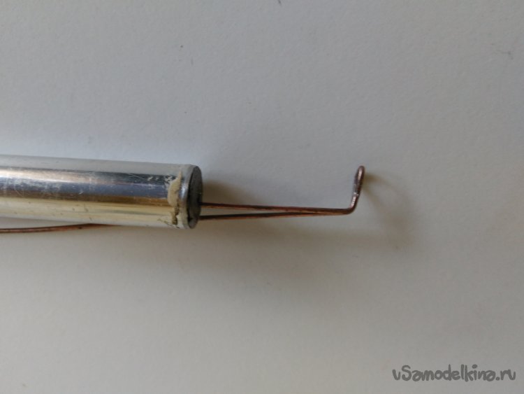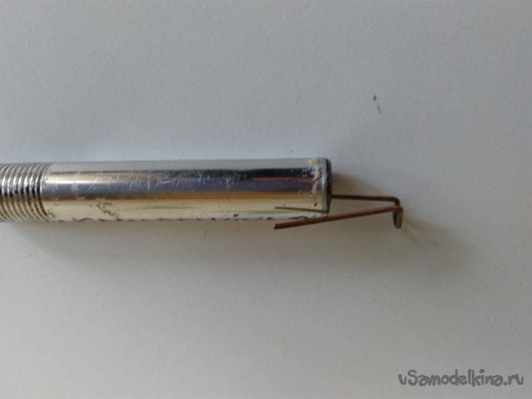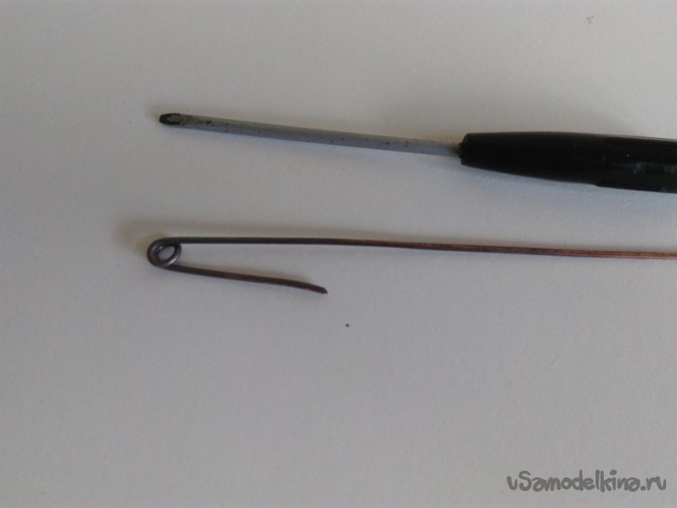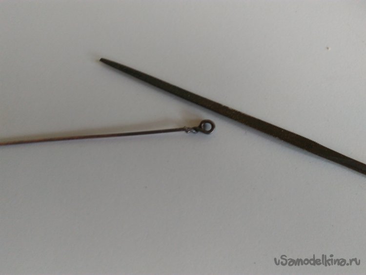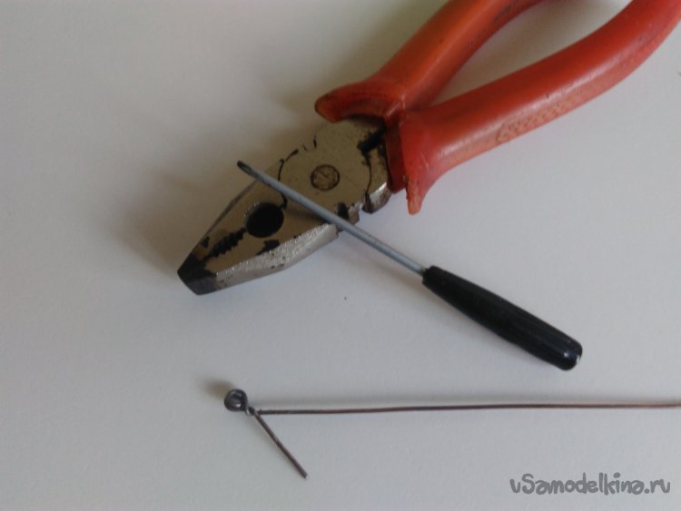Закрутил двойную петлю на тонкую отвертку, диаметр в принципе не важен это (для привязывания лески или шнура). Остаток откусил и загладил надфилем.