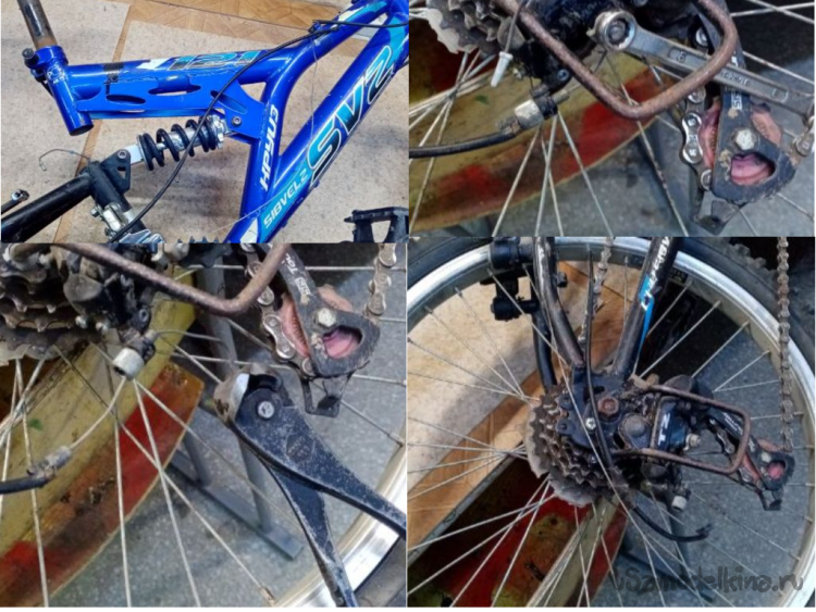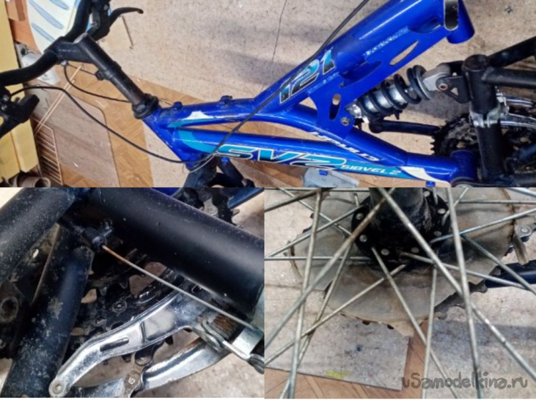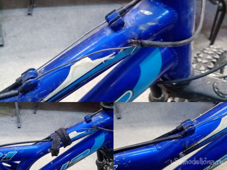 Повреждены все тросики управления и боудены. Не работают из-за этого тормоза и переключатели скоростей. Хотя сами механизмы целые. Сломаны манжеты переключения передач на руле. Рычаги тормозов целые. Резина никакая на колесах. Но восьмерок нет.