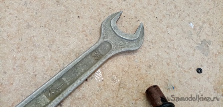 Гайка колеса пристыла намертво. ВД-40 не помог. Аккуратно грею гайку газовой горелкой. Не поддается рожковому ключу. Накидного такого размера у меня в моделке нет. Покопался в противогазной сумке, подошел суровый свечной ключ. Вставляю в отверстие мощный болт. Этим рычагом наконец, открутил гайки. Снимаю колесо.