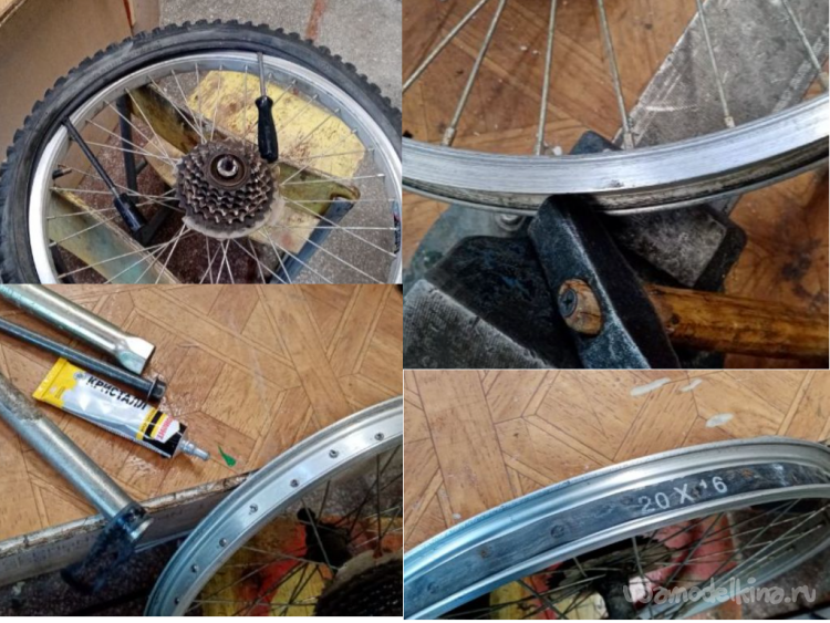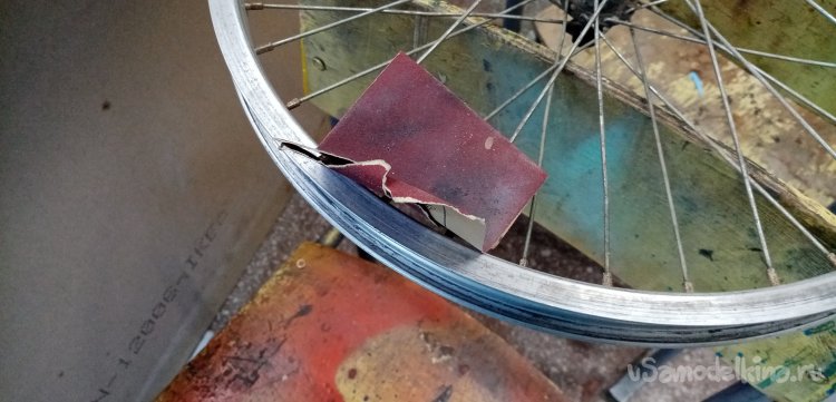Снимаю шину и лопнувшую камеру. Немного выправляю обод молотком и зачищаю шкуркой. На клей « Момент супер кристалл» приклеиваю защитную полосу на головки спиц.
