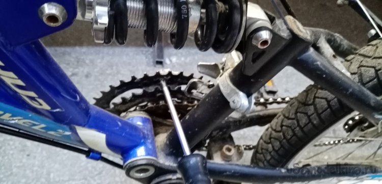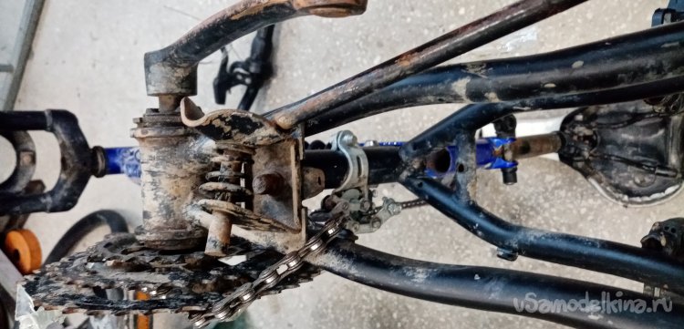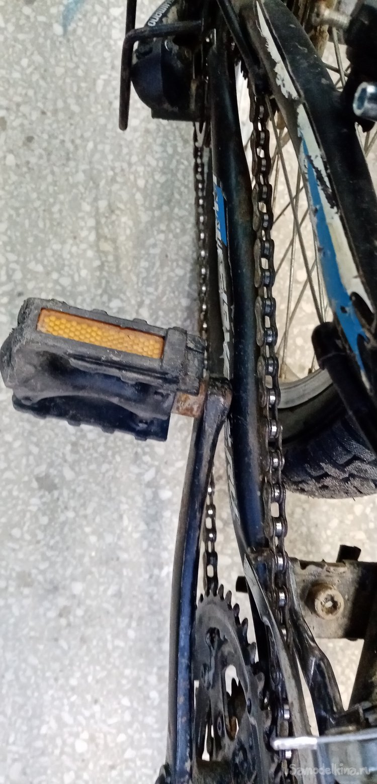 Нужно еще поправить педаль, немного задевает за заднюю вилку рамы. Снимать не хочется совершенно. Нахожу массивную железную болванку, прижимаю к штоку, аккуратно постукивая кувалдой, выпрямляю педаль. Теперь порядок, ничего не задевает.
