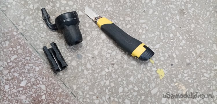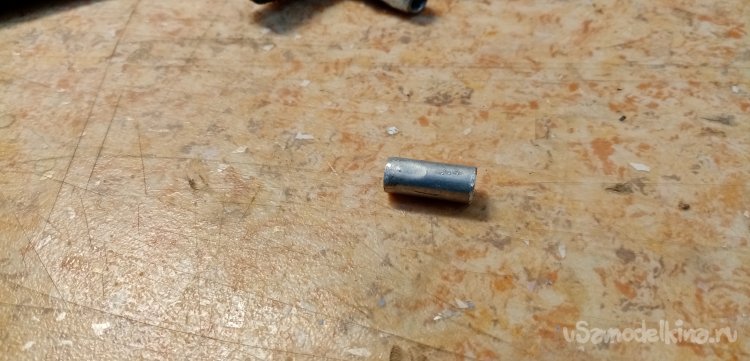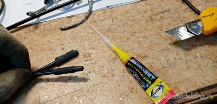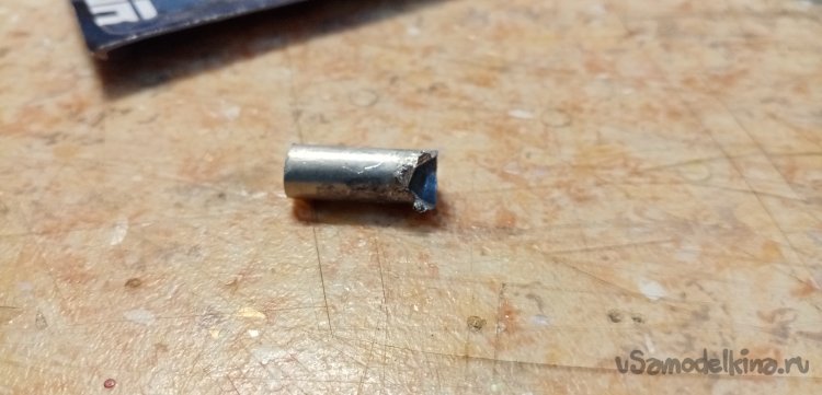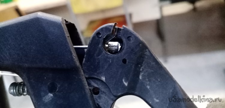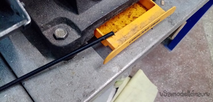 Второй наконечник тросика проходит через специальный наконечник и изогнутую трубку в клещам колодок. Этой маленькой детали не было. Как временное решение нахожу подходящую по внутреннему диаметру трубку, немного пилинга надфилями и сверлилинга и трубка хорошо подошла по месту.