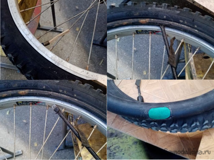 Монтирую одну сторону покрышки, аккуратно вставляю полуспущенную камеру и забортовываю покрышку.