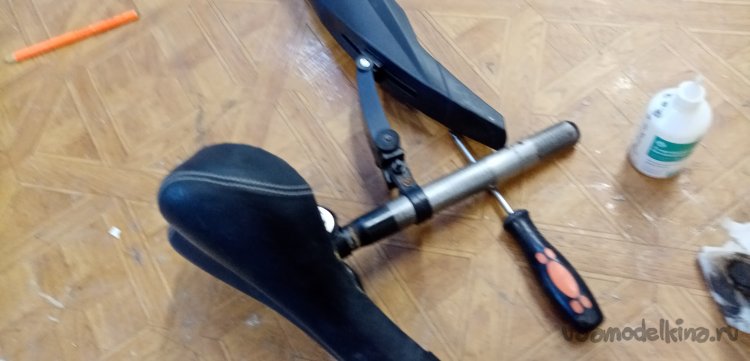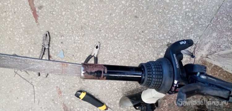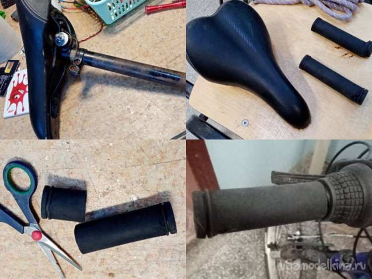 Меняю седло, наконечники на ручки оказались немного длинные. Понятное дело у него большой велосипед. Обрезаю по размеру. Резинки весьма туго накручиваются на ручки велосипеда. С рулем порядок.