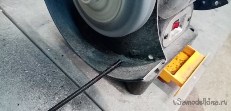 Начинаю устанавливать проводку управления с тросиками и боуденами. Отмеряю нужную длину боудена на первом этапе проводки. От переключателя до крепления на раме. Нужно чтобы боуден не сильно торчал вперед, но и в тоже время не затруднял движение тросика на перегибе при повороте руля. Отрезаю боуден обыкновенными еще советскими кусачками. Вполне справляются, с легким щелчком откусывают. Торцы зачищаю при помощи точила. Периодически охлаждаю кончик. Иначе может расплавиться пластик внутренней и внешней оболочки.