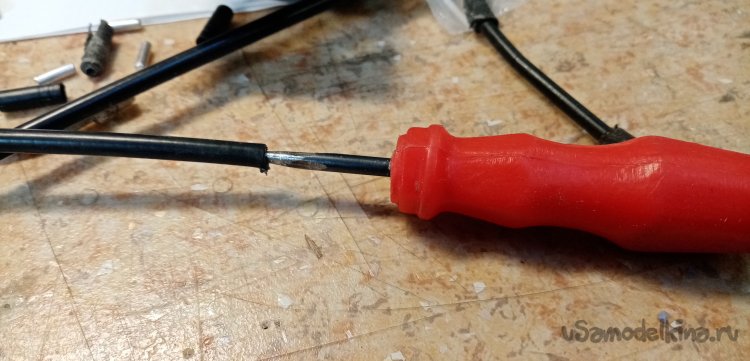 Немного поправляю внутренний диаметр на боудене при помощи шила, можно вставлять тросик.