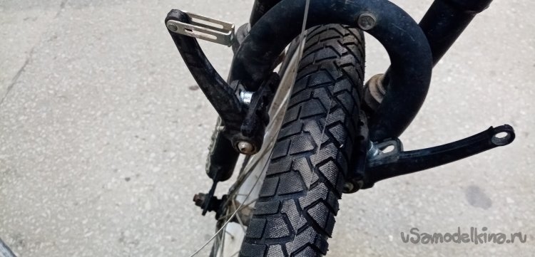 Переднее крыло подошло к маленькому колесу без проблем. Оно имеет два варианта крепления. К втулке руля снизу и к поперечине передней вилки. Более красиво установил во втулку руля.