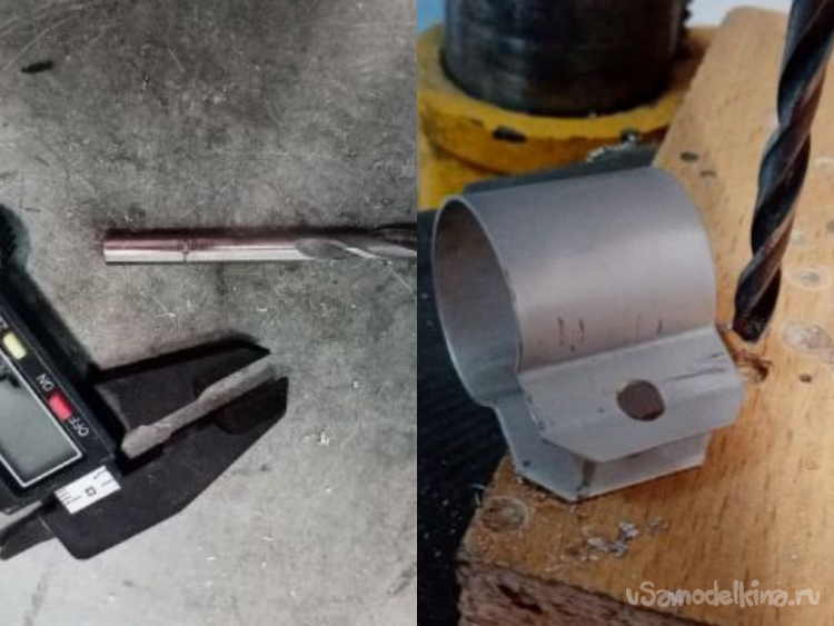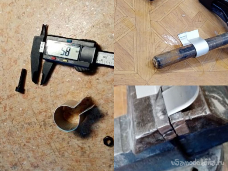 С задним колесом небольшие проблемы. Сломан хомут крепления. Начинаю изготовление нового. Отсталой алюминиевой крышки ноутбука отрезаю полоску нужной ширины и длины. При помощи тисков отгибаю ушко, огибаю по диаметру трубки седла. Затем отгибаю второе ушко. Можно просверлить отверстие под болтик крепления. Хомутик готов.