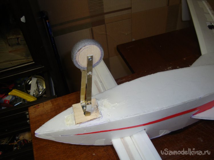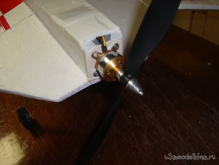 Вклеил кусочек утеплителя и кусочек 3 мм. фанерки, для установки мотора. Установил мотор.