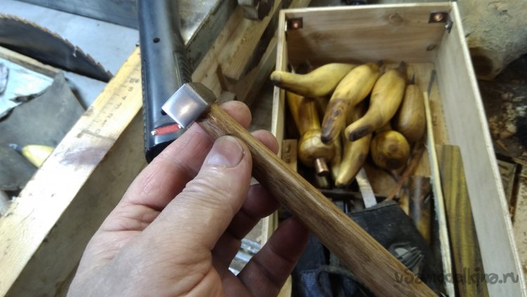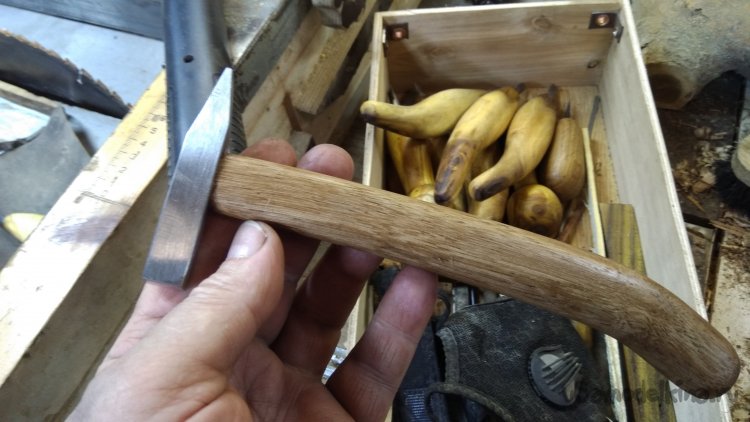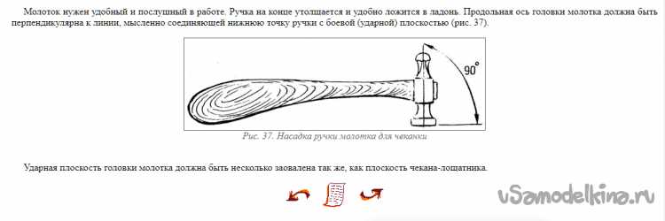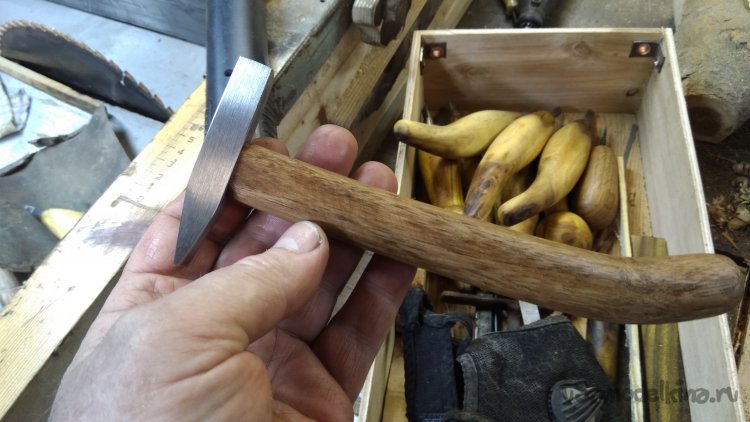 Для всечки металла в металл, применяют с широким бойком и шариковым носиком, с изогнутой рукояткой, для того чтобы кисть руки не надо было сильно загибать. Примерно по рисункам сделал себе такую рукоятку. У них правда рукоятка достигает 350 миллиметров, у меня всего 210, и я не вижу пока причин делать рукоять длиннее. Возможно техника всечки такая? Что баланс должен быть в руке а не смещён к телу самого молотка (тело молотка, это ещё один термин, сама железка с передним и задним бойком именуемым носиком )))