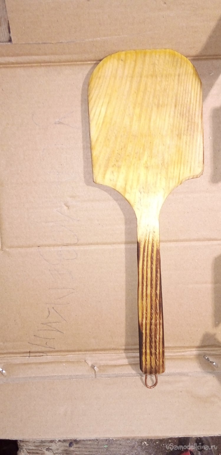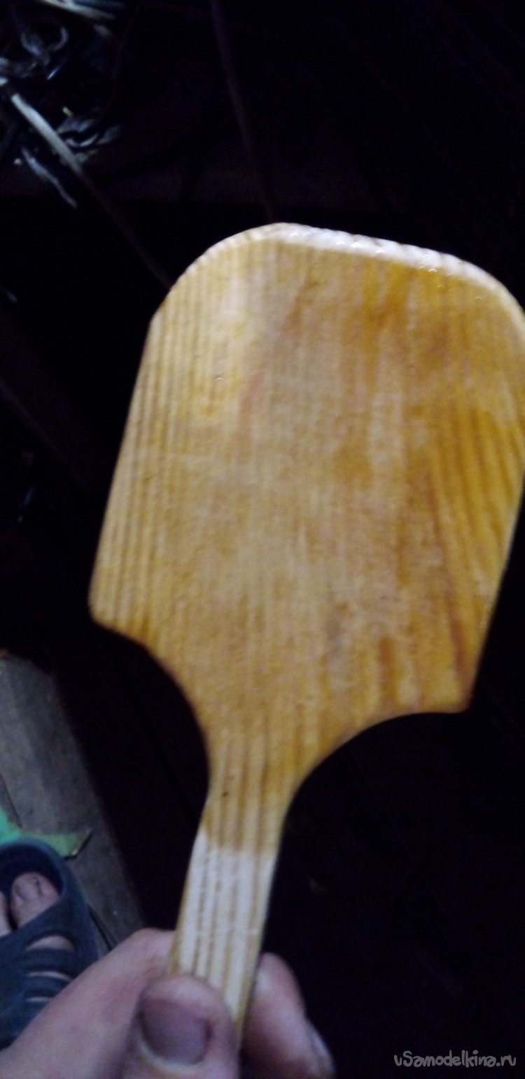 Для лучшего перемешивания варева, хотя лучше сказать жарева, так как лопатку принято эксплуатировать вместе со сковородой, на лопатке нужно сделать заточку. Добиваемся вот этого результата.