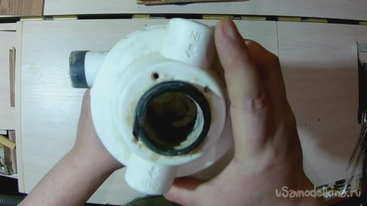 Затем следует дренажная труба на которую насажен колпачок, сделанный из бутылки от ацетона, который по внутреннему диаметру идеально подошёл по размеру к отводу, в который мы вставили HEPA-фильтр.