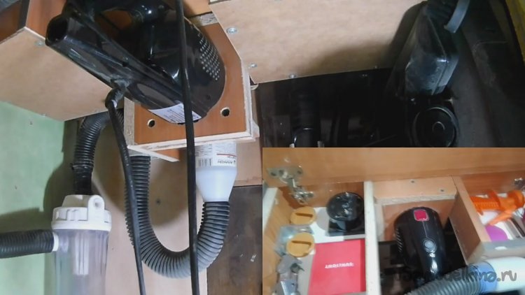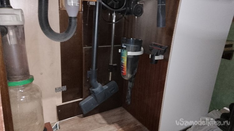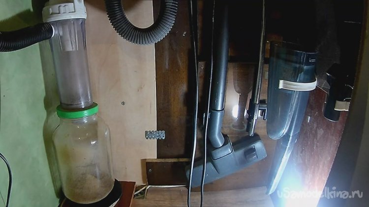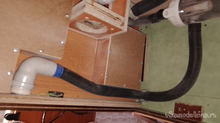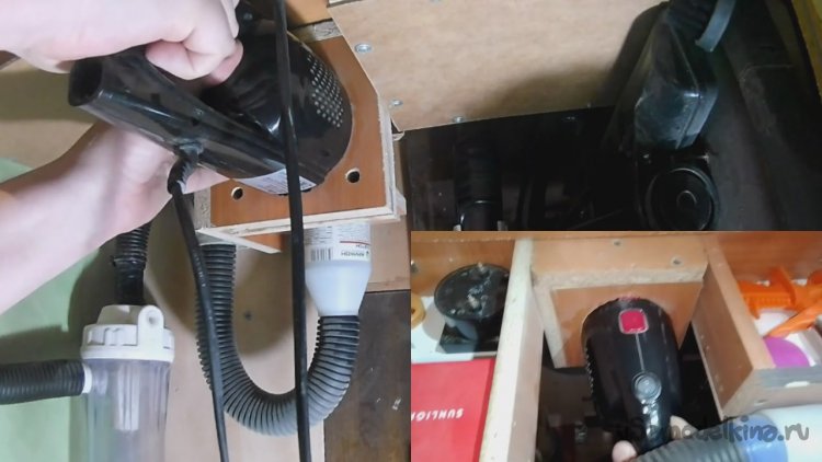 Сделал под пылесос такую конструкцию, которую закрепил с нижней стороны пыльного шкафа. Это так сказать бутерброд из ЛДСП и ламината. Просто прорезал отверстия в деталях, копируя крепления и пазы, которые были на пылесборнике. И склеил этот бутерброд клеем.