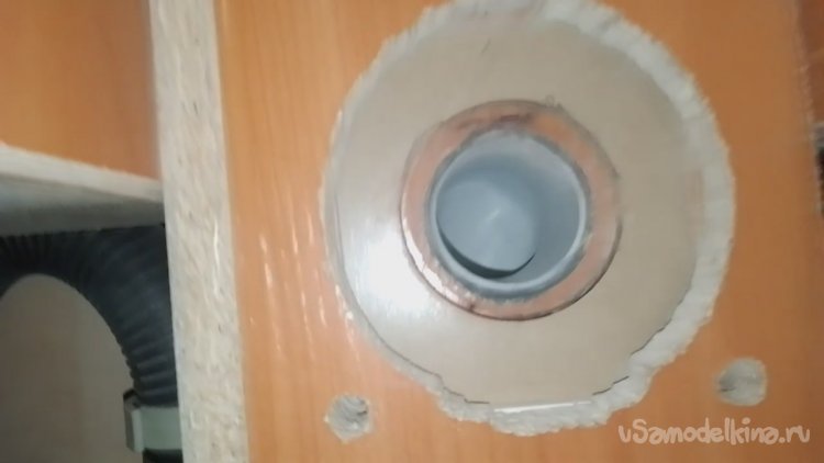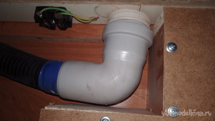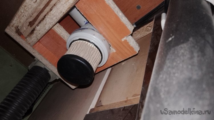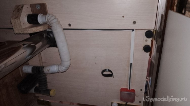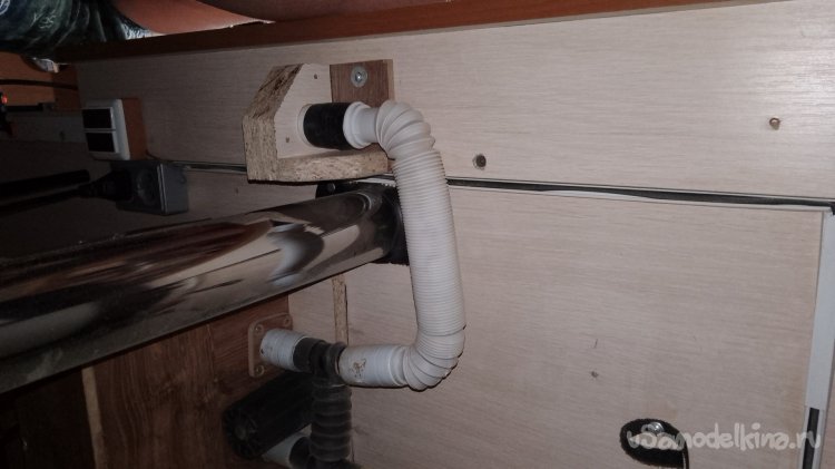 Эта труба вставляется в отвод и через трубку соединенную через манжету выходит через упорную планку шкафа на...