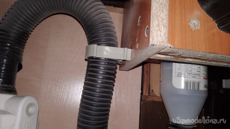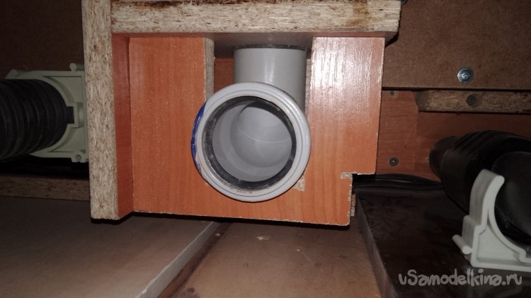 С обратной стороны вклеил угловой соединитель для труб (Отвод 40/90) с резиновым кольцом. В него отлично по диаметру подходит дренажная труба.