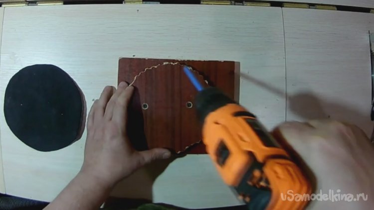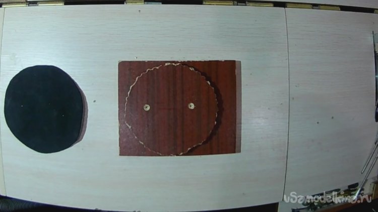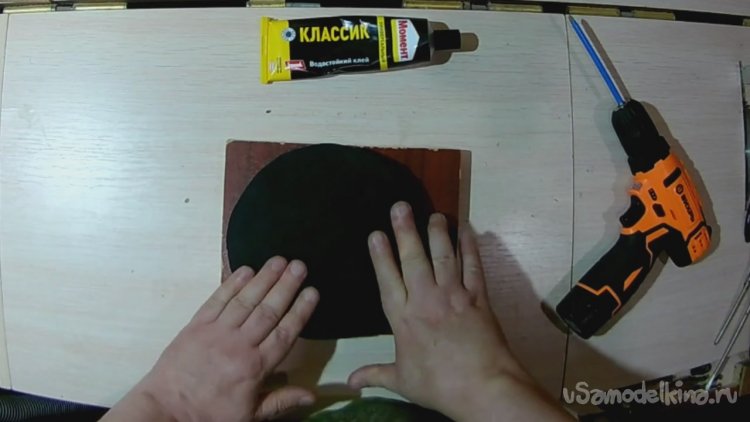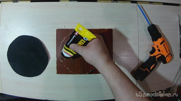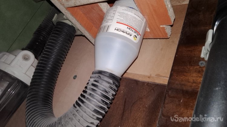Ну вот, когда все элементы на своих местах, переходим к окончательному этапу нашей работы. Это подключение пылесоса и сборника пыли. Пятилитровая банка оказалась немного коротковата по высоте, поэтому пришлось городить подставку. Взял старую лакированную ЛДСП панель от какой-то советской стенки или шкафа, точно сказать не могу, и выпилил пару деталей. Скрутил саморезами и приклеил сверху кругляк, вырезанный из резинового коврика для занятий политесом.
