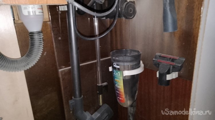 Далее возьмём пылесос и отсоединим рабочую часть от пылесборника. У пылесборника есть своё место в "пыльном шкафу", туда его и устанавливаем.