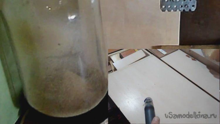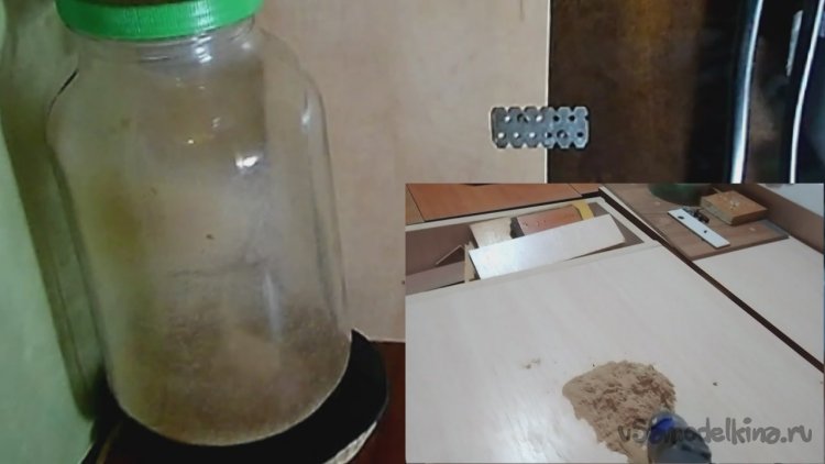 Установил эту нехитрую конструкцию в угол "пыльного шкафа" и водрузил сверху нашу банку.