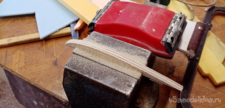 Поскольку два крайних шаблона в приспособлении одинаковые, копирую по готовому и выпиливаю пару. Затем устанавливаю в тиски и обрабатываю утюжком со шкуркой.