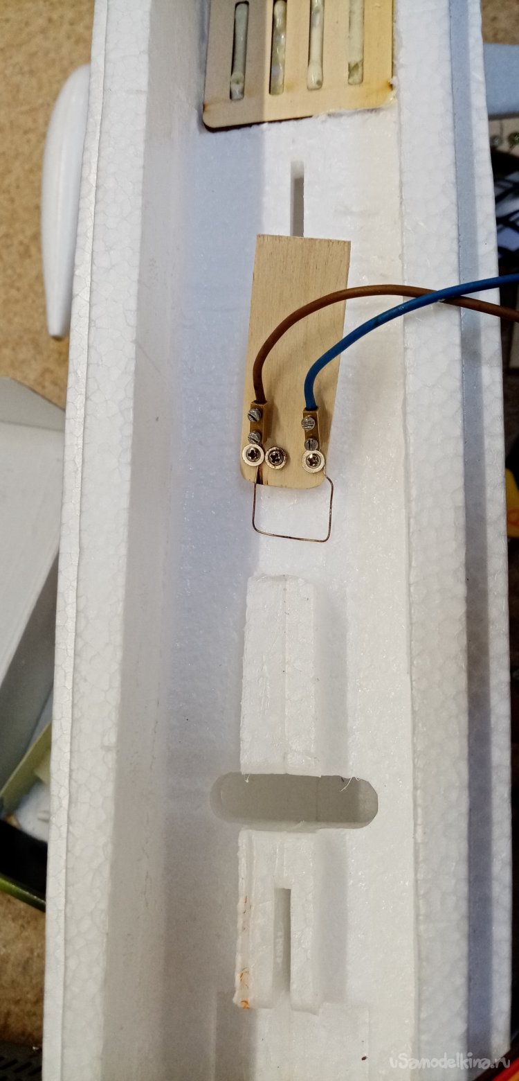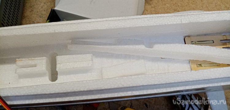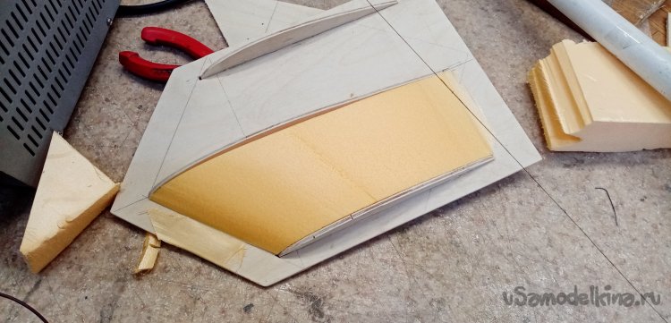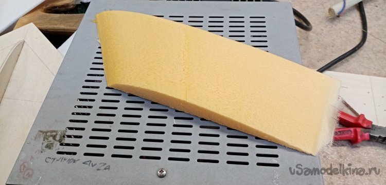 Начал оснащение модели. Но у фюзеляжа есть слабое место. В нем вырезаны большие окна для установки крыльев. В первой модели часто ломалось именно там при жестких посадках. Решил сразу укрепить это место коробочкой из «фруктовой фанеры». Для этого было нужно срезать лишний пенопласт внутри. Ножами и скальпелем не подлезть. Нужно изготовить терморезак под конкретную операцию.