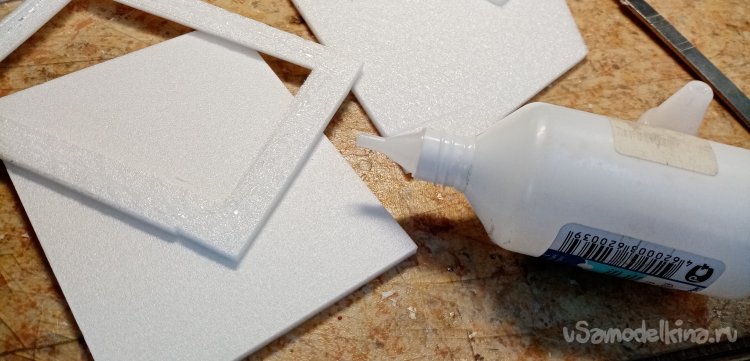 Затем приклеиваю заготовку рамки на заготовку основания клеем титан. Его для удобства пользования разливаю в бутылочки с тонким носиком. Например, от косметики или перекиси водорода.