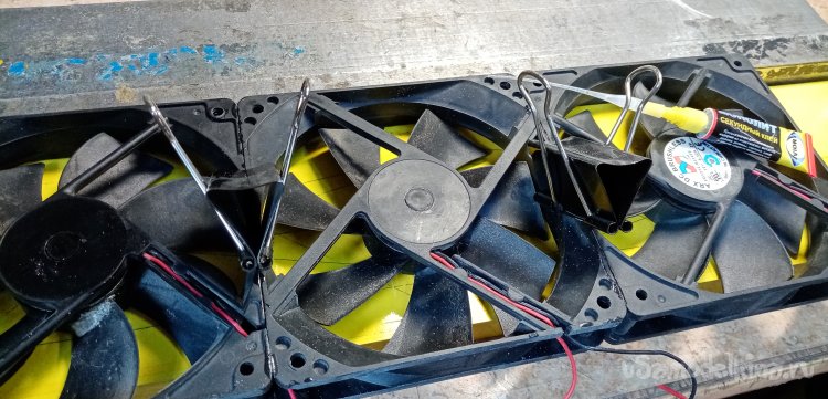 Есть у меня некоторое количество вентиляторов охлаждения от блоков питания. Подобрал три блока, соберу в один длинный вентилятор на ножках. Питание от блока в 12 вольт нормальной мощности. На три лопасти должно хватить.