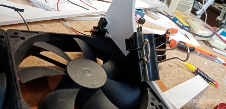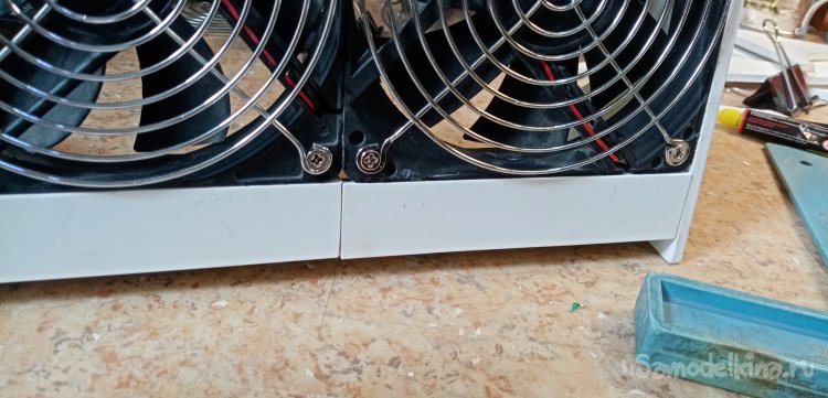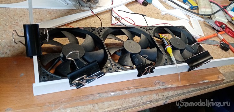 Собираю рамку по новой уже на два вентилятора. Все заклеиваю на циакрине и прижимаю канцелярскими прищепками.