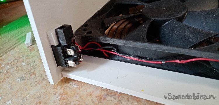 Для полного фарша устанавливаю выключатель и гнездо разъема питания. В стенке прорезаю по разметке отверстие под включатель от блока питания. Он просто вставляется как на пружинках.