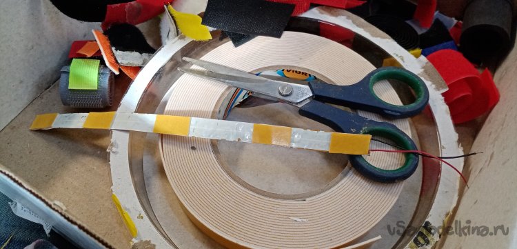 Светодиодную полоску белого цвета приклеиваю на двухсторонний крепкий скотч для зеркал.