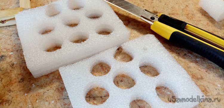 Затем разрезаю блок поролона по плоскости и в образовавшиеся отверстия вставляю оставшиеся столбики.