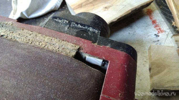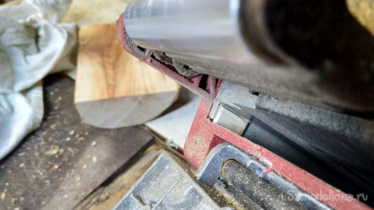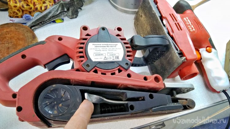 Откидывающуюся и фиксирующуюся в нескольких положениях переднюю рукоятку. С её помощью можно закрепить на столешнице машинку так, чтобы лента была вертикально, то есть как гриндер может работать. Ну и конечно её можно закрепить лентой вверх. Удобные мелочи.