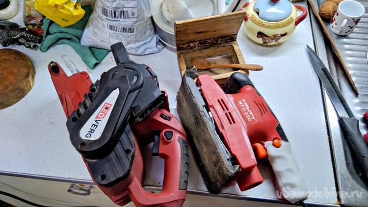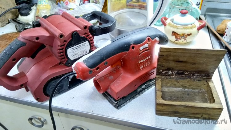 Щлифовальные машинки обе реанимировал. Инструментов много не бывает. Дома-то, в своём хозяйстве )) У них разные способности, ленточной я конечно пользуюсь гораздо чаще, но и вибрационная не лишняя, она не оставляет ни полос, ни кругов. После неё мелкий шерех завитками в пару миллиметров, идеально для подготовки к гладкой окраске. Достигается это вращающимся мотором с эксцентриком, высокая скорость вращения и малый ход перемещения дают мелкие завитки на шлифуемой поверхности. Но у неё маленькая производительность, зато не нароет ям как обычная ленточная, не оставит больших кругов как эксцентриковая она-же орбитальная и производительнее чем обычный ручной утюжок или брусок. Ну в общем разные цели, разные инструменты.