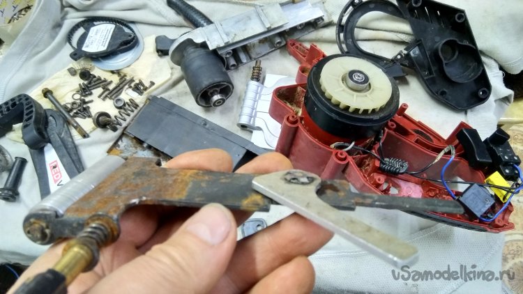 Сломанный рычаг натяжения ленты был пластмассовый. Не вижу причин делать аналогичный или искать в запчастях. Сделал новый из дюралюминия.
