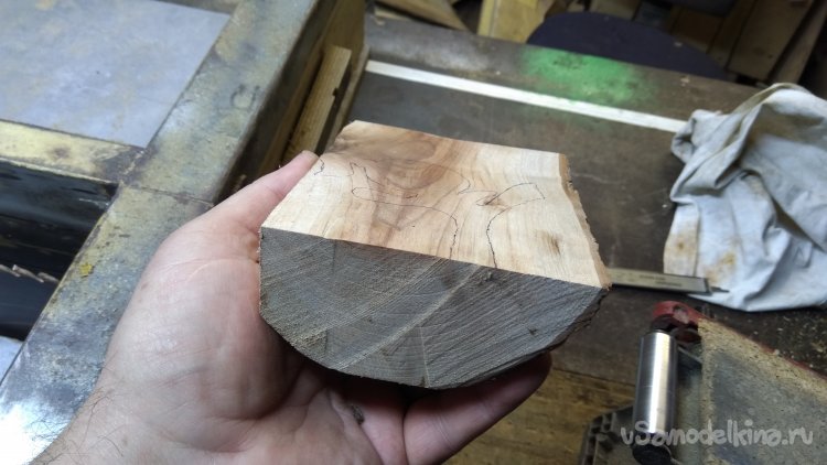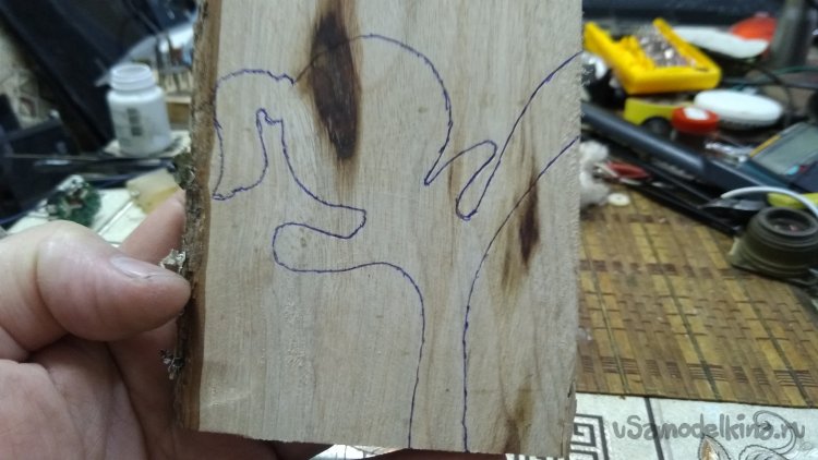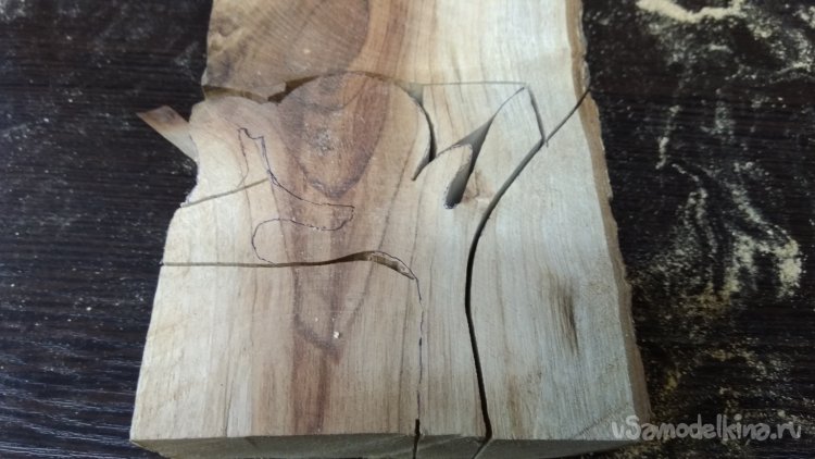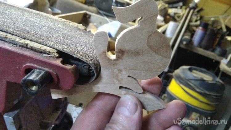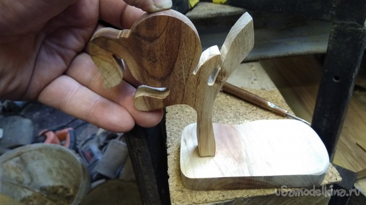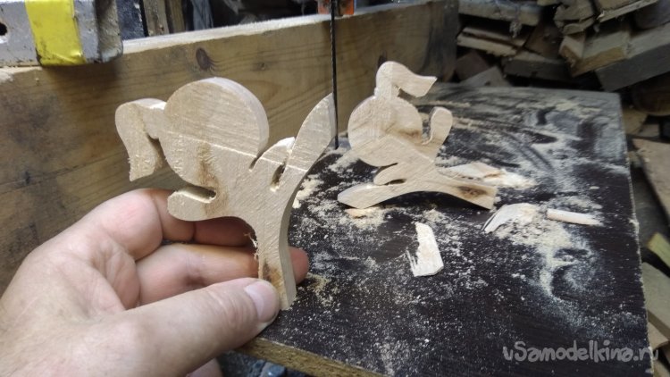 Отпилил чурбачок, опилил грани, набросал эскиз и выпилил. Пилил на ленточной пиле. Это быстро и качественно. Умышленно заготовку взял более толстую, потом распилил фигурку повдоль на этой-же пиле. И получил пару симметричных фигурок. Из той-же чурочки, и даже из той-же плашки выпилил основание И так-же распустил повдоль.