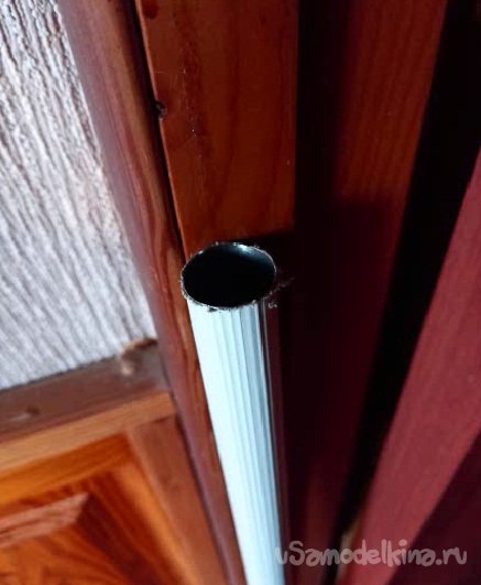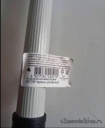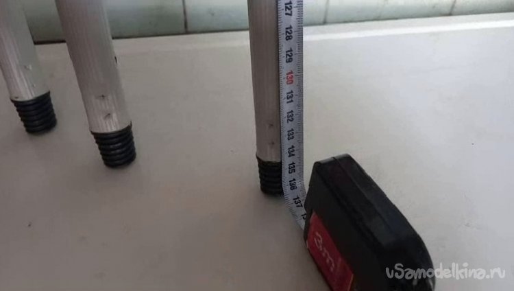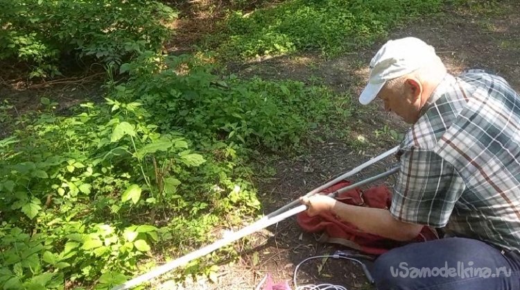 Поэтому, было решено изготовить разборный удлинитель, в виде длинной палки. Четыре метра позволит использовать прибор как с лодки при обследовании дна, так и с берега, ощупывая коряги и камыши. Поначалу думал удлинитель скрутить при помощи деревянных черенков для граблей. Но зайдя в хозяйственный магазин, выбрал тонкостенные, прочные, металлические, практически невесомые, ручки для швабр, покрытые пластиком, длинной по 1350 мм. каждая. Взял три штуки, больше в магазине не было. Получился удлинитель четыре метра.
