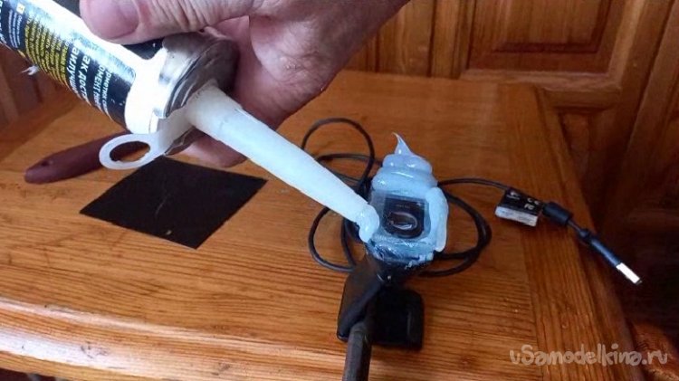 На объектив наклеил прямоугольный кусочек прозрачного стекла и провел контрольную съемку, искажений не было, через сутки облил пластик камеры толстым слоем герметика. Получилась камера для зимней рыбалки, это когда бурят лунку, опускают в нее камеру и смотрят, есть ли подо льдом рыбка, или надо идти дальше в ее поиске.