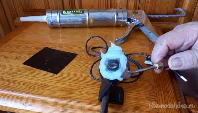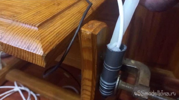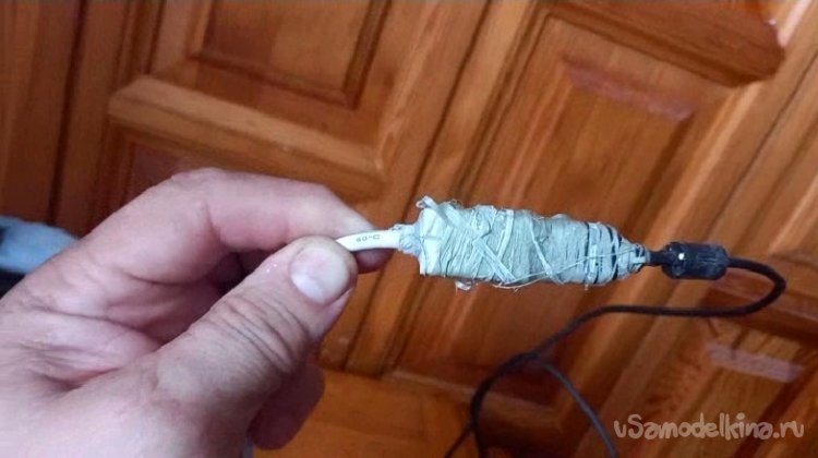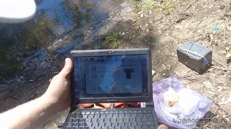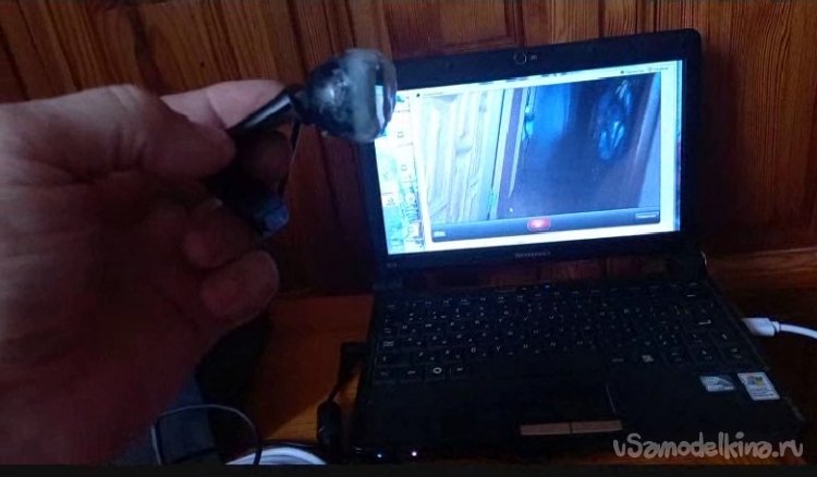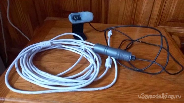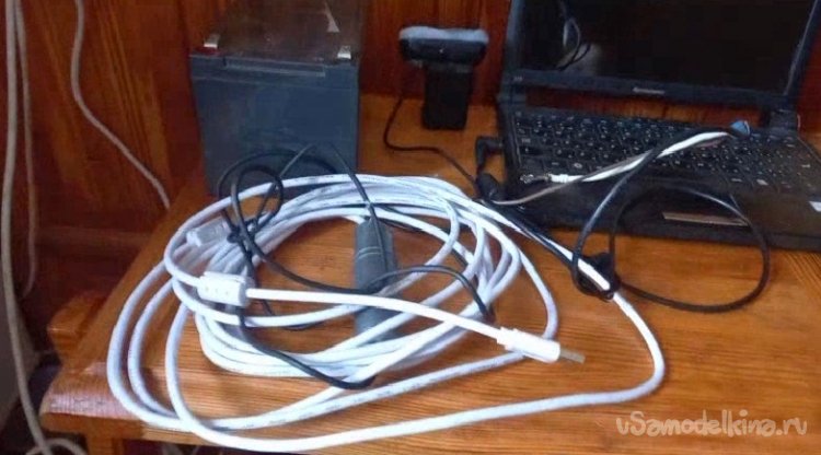 Первым делом необходимо было собрать в кучку , что будет обнаруживать цель под водой, по чему будет передаваться видео сигнал и на чем это все можно увидеть. В наличии у меня имелся нетбук и вэб камера. Казалось, бери четырех жильный экранированный провод и наслаждайся. А нет, сколько не пробовал перепаивать провода, монитор выдавал, что нетбук камеру не видит. Спасибо добрым людям, подсказали приобрести USB удлинитель. Пять метров не испортили картинку и не спровоцировали задержку. Соединил кабель от камеры и удлинитель через разъем. Не стал резать и паять, просто обмотал синтетическим шнуром и покрыл толстым слоем клея «космофен». Теперь соединение не разойдется. Ну и для страховки надел трубку и заглушил концы силиконом.