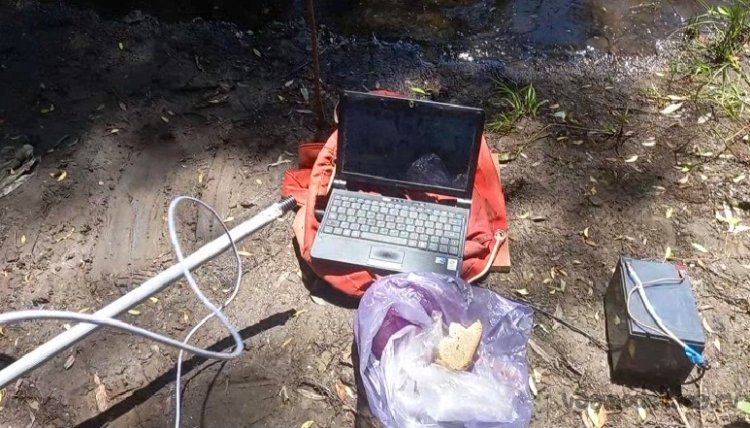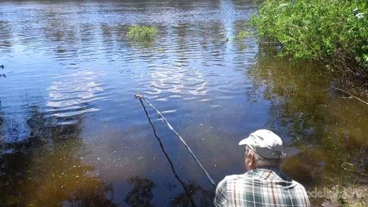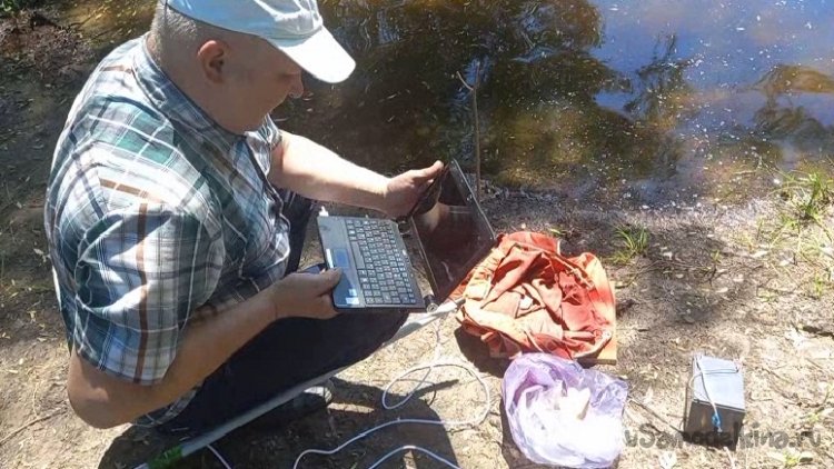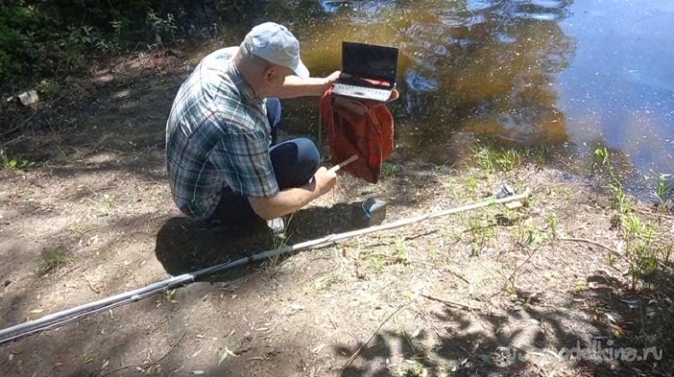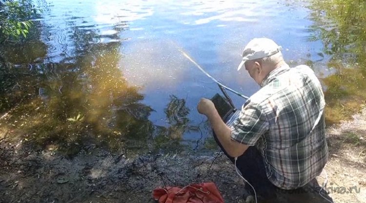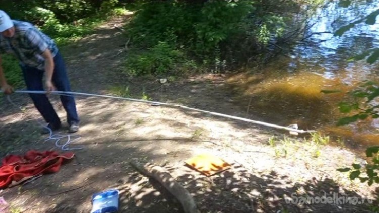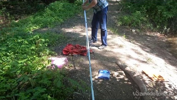 Пробный выход , чтобы познать ошибки, я совершил на речку возле дома после вчерашнего продолжительного ливня. Закинув рюкзачок с аккумулятором за плечи, я подошел к воде. Состыковав черенки, пристроил камеру и подсоединил кабель к нетбуку. Опустив камеру в воду я стал приближаться к кромке воды, тем самым удаляя камеру от берега и погружая ее в глубину. Выяснил, что конструкция имеет плавучесть, пришлось добавить грузики. И вот на мониторе распахнулись двери подводного царства.
