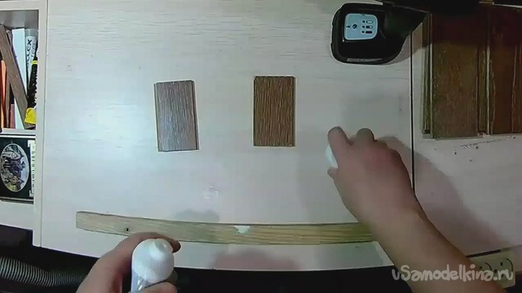 Берём две заготовки из ламината, предварительно очищаем и обезжириваем, и наносим на них клей.