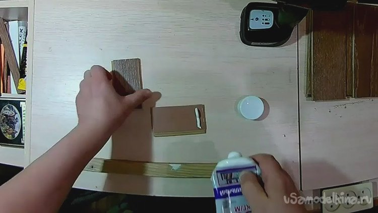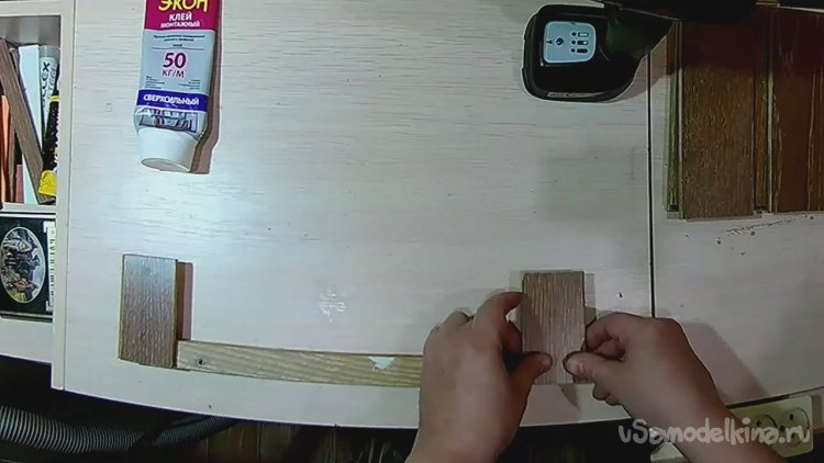 Далее прижимаем обе детали с нанесённым клеем к бруску.