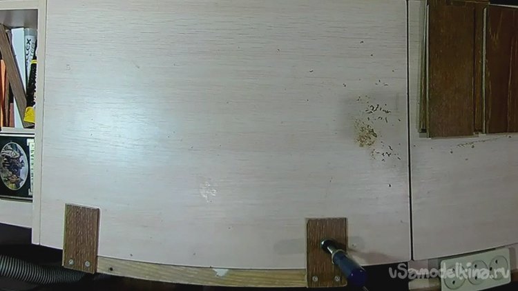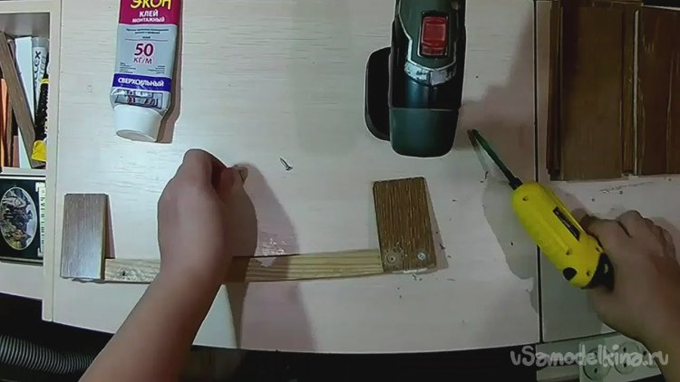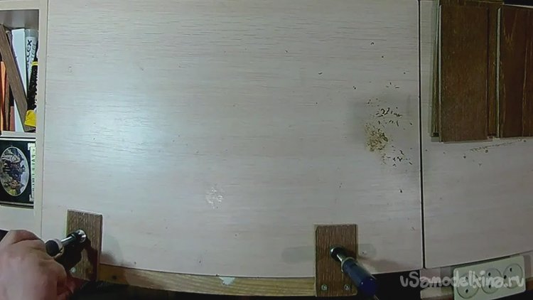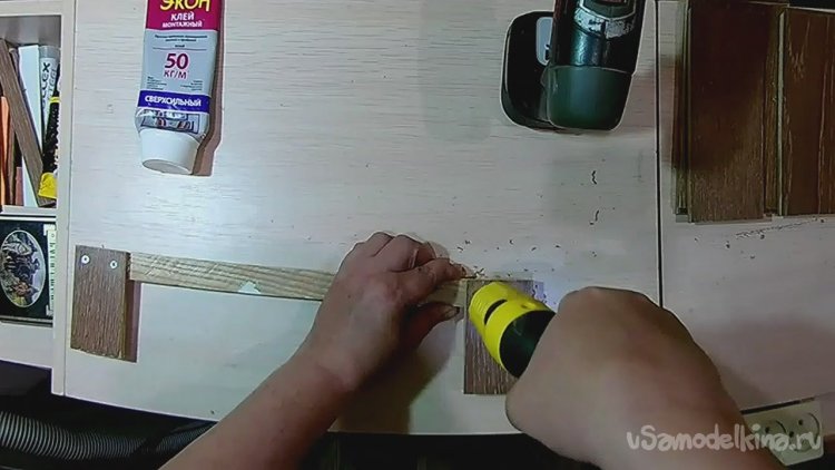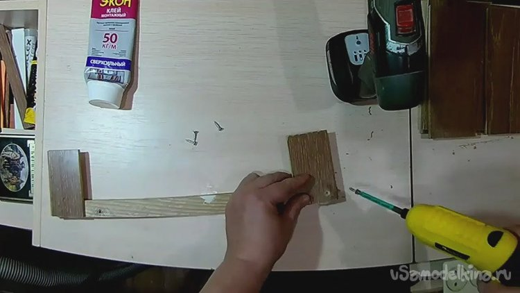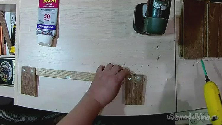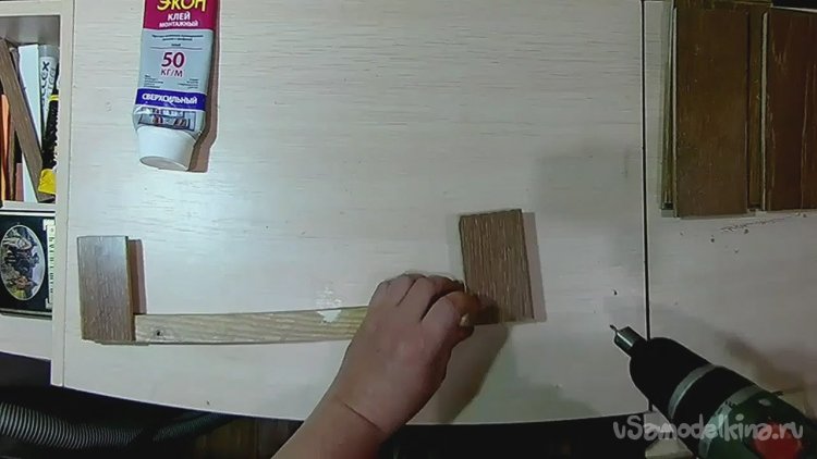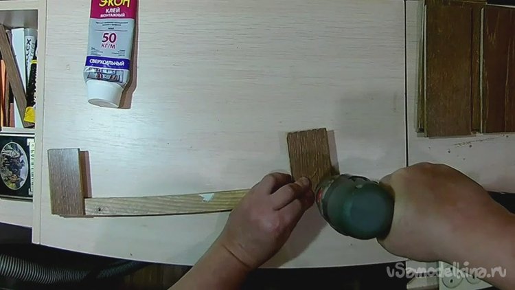 После сверлим под второй саморез и фиксируем деталь окончательно, убирая излишки клея.
