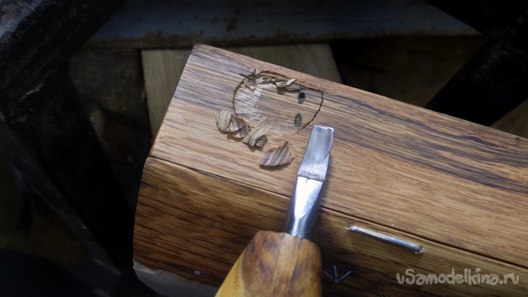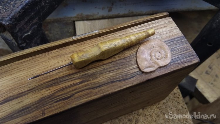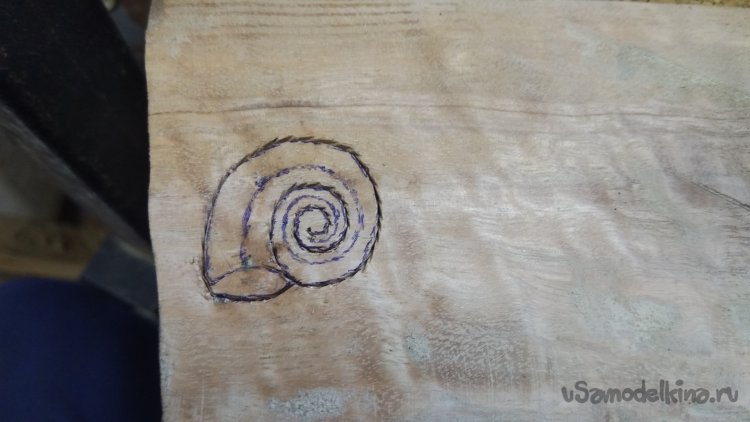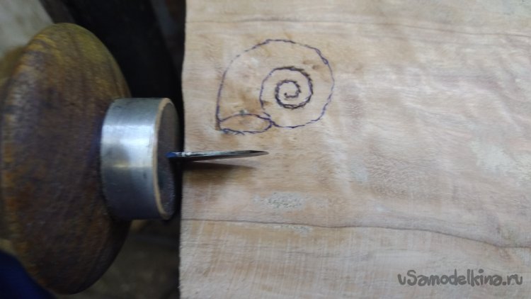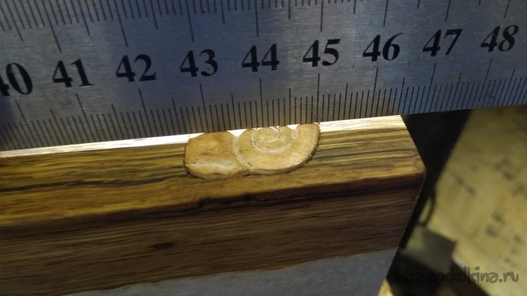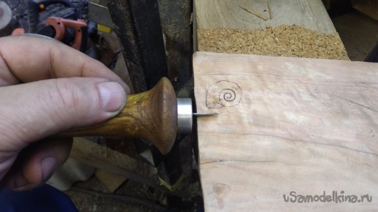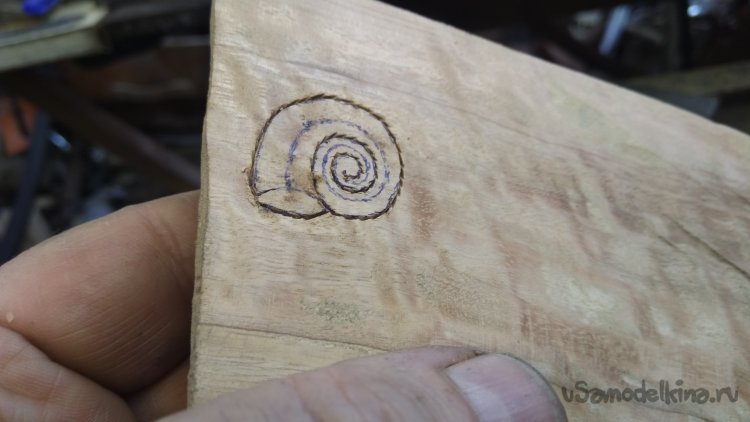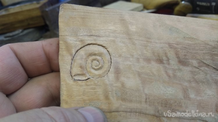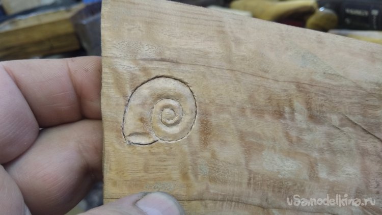 Сначала прорезал контур в глубину, стараясь держать нож перпендикулярно поверхности, потом несколько наскучило, выпиливать ведь буду из массива, автоматически кромки ровные будут. Занялся вырезанием завитков на ракушке.