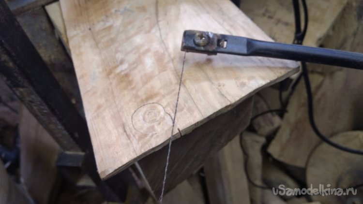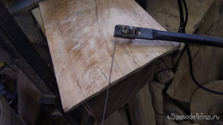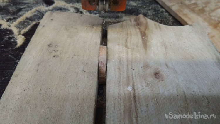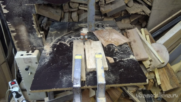Попробовал пилить простым лобзиком, что-то мне этот процесс совсем не по нраву. Эвкалипт свилеватый, вязкий, пилка идёт с трудом. Ну и ладно, на ленточной пиле в шесть секунд выпилил по контуру.