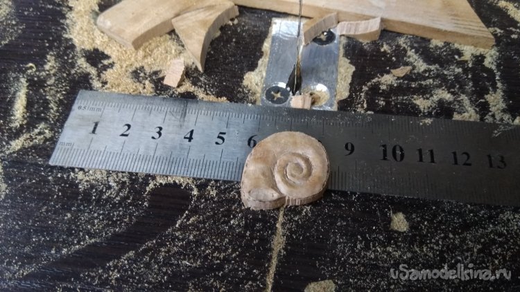 На ленточной пиле поставил пару планок, зажатых струбцинами. Сдвинул планки по размеру детальки, сначала сделал пробный распил на неответственной щепке. Пилит замечательно, не крутит не заваливает, и точно по центру. Ну и замечательно, распилил вдоль ракушечку, два миллиметра толщина каждой получилась, точно, как пятирублёвая монета.