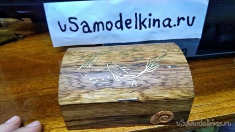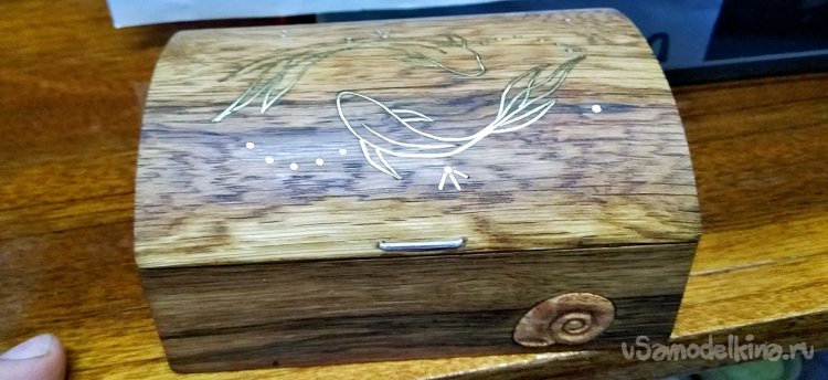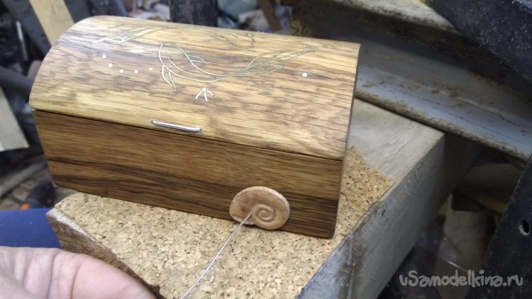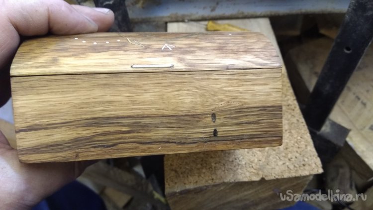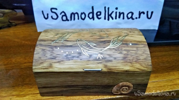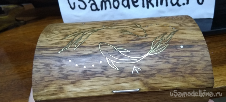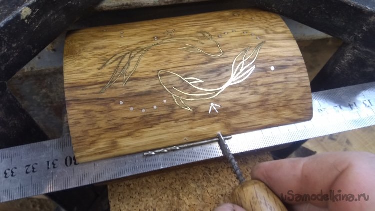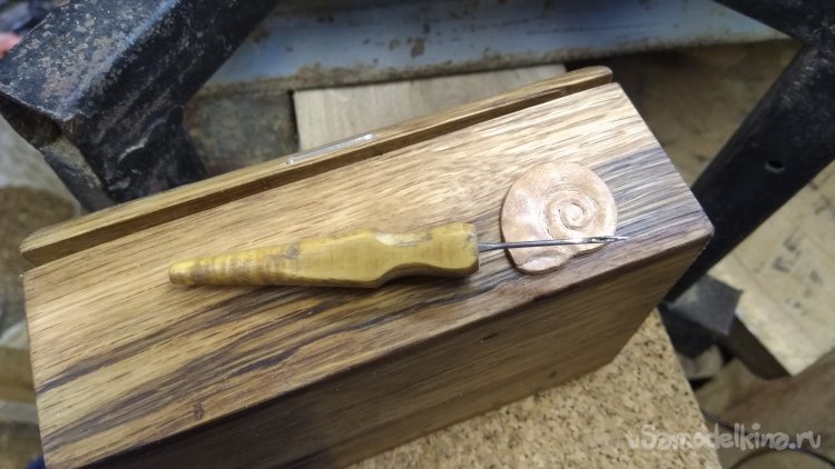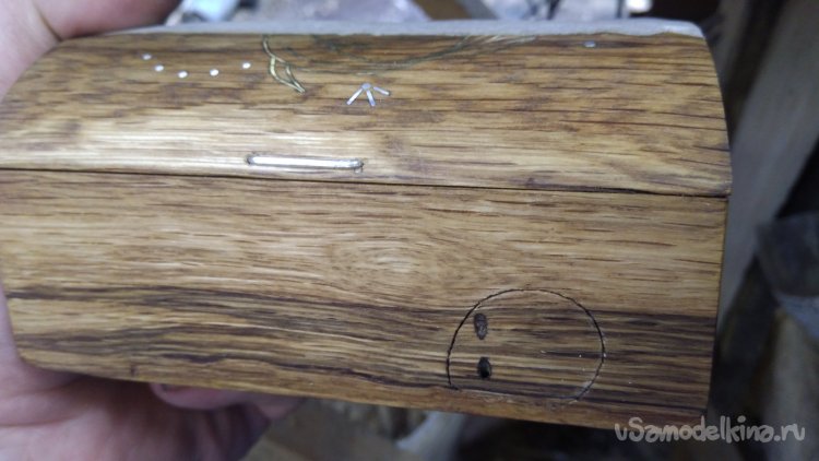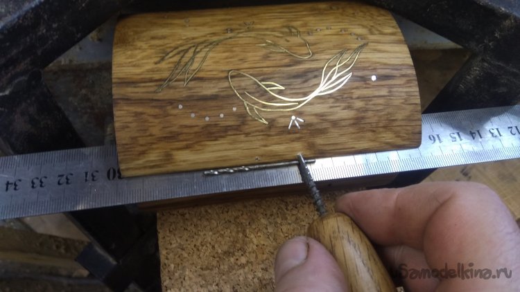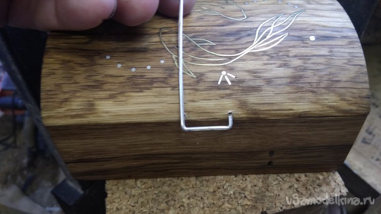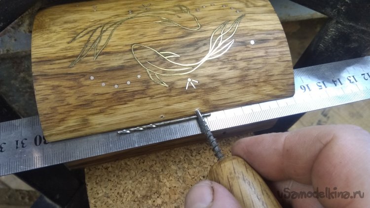 Далее перенос размера на шкатулку. Сделал шило из обычной швейной иглы, у меня давно оно. Удобно что малюсенькая рукоятка, калёное и полированное острие. Вот этим остриём наколол по контуру детальки приложив её к шкатулке. Если процарапывать, то может по волокнам съехать острие вбок, а при прокалывании смещаться некуда, только чуть по годовым кольцам может быть смещение, за счёт разной плотности древесины.