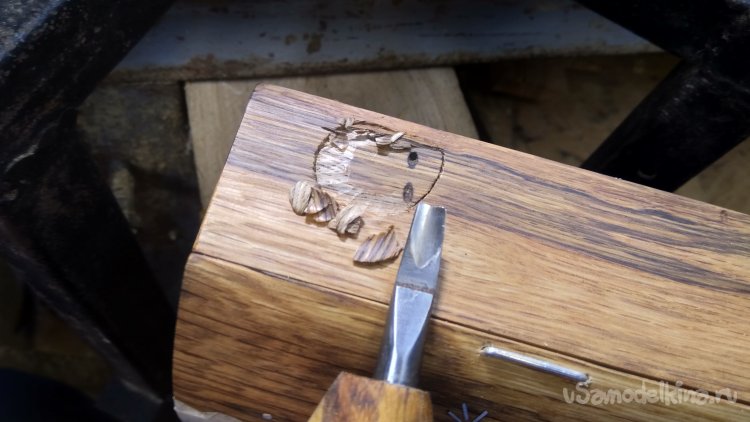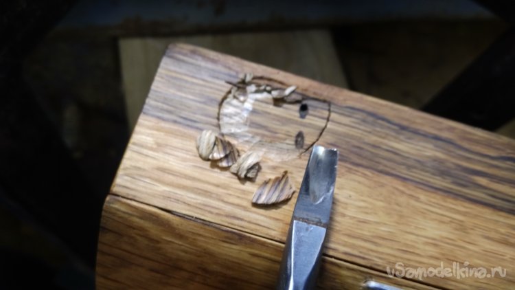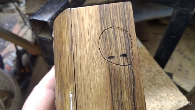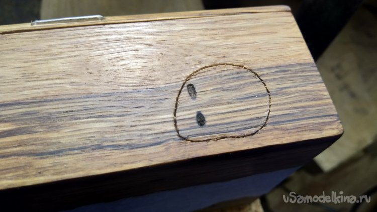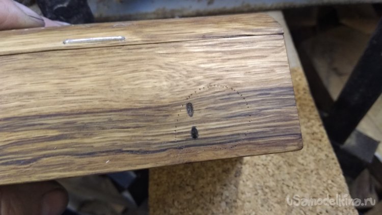 Разметка по месту подручными средствами, отверстие от короедов слишком близко к нижней кромке, если его рассверливать, то отколется.