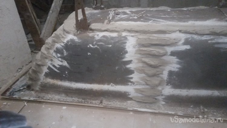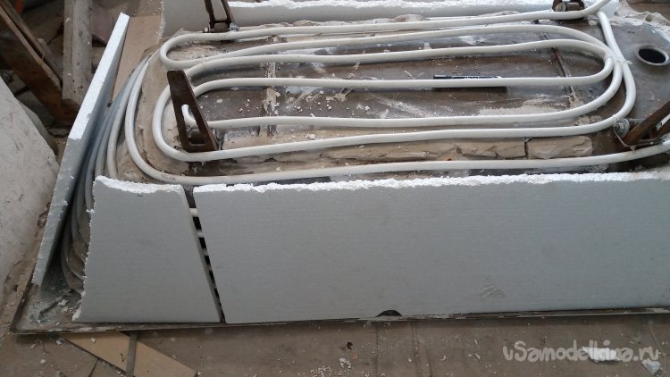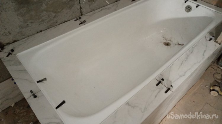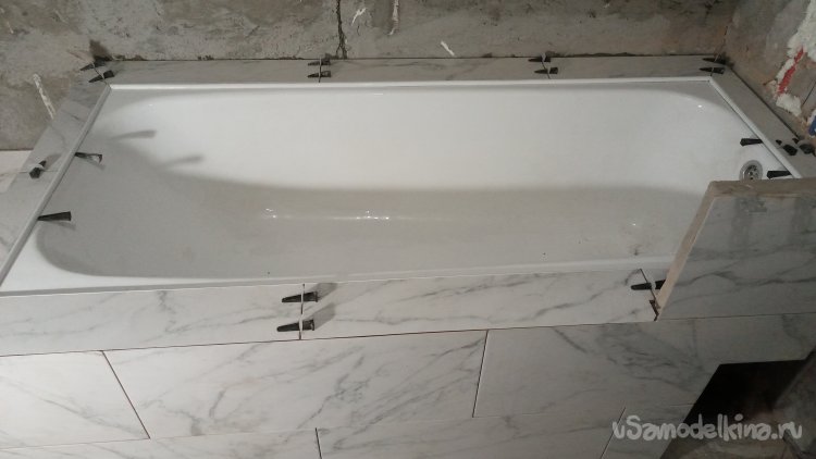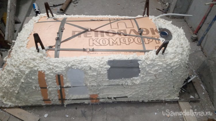 Ванну можно устанавливать на своё место. Ленту, пересекающую её сверху, я обрежу в самом конце работ. К тому времени снимутся все напряжения в пенопласте - он останется в той форме, которую ему придала лента. (Это проверено. Изогнутый и зафиксированный на долго пенопласт остаётся так-же изогнутым после того, как его "освободили")))