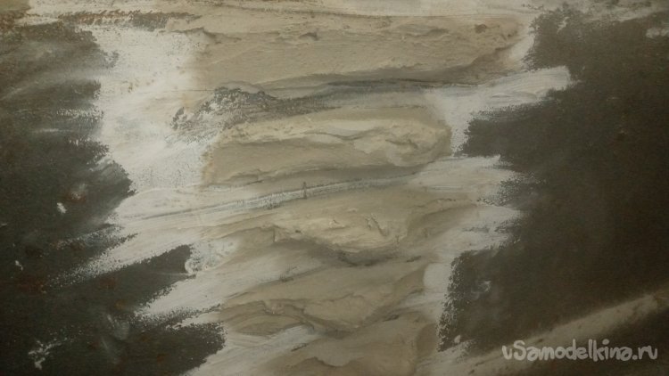 Замешав состав погуще, я нанёс на ванну шесть толстых вертикальных полос - четыре "по углам" и по одной - в серединах длинных сторон. После чего, вооружившись обрезком металлопласта, продавил поперечные полоски с нужным мне шагом. Получились вот такие "гребёнки":