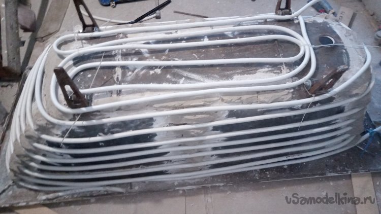 Но как её намотать???. Ведь ванна имеет сужающуюся, округлую форму! Труба просто будет съезжать! Перебирал множество вариантов. От приваривания кронштейнов до приклеивания пластиковых клипс.... Первый вариант не прошёл. К пустой не приваришь - от точечного нагрева повредится эмаль с внутренней стороны. Наполнить её водой??? Но, тоже не решился. Вдруг, испорчу?!!!