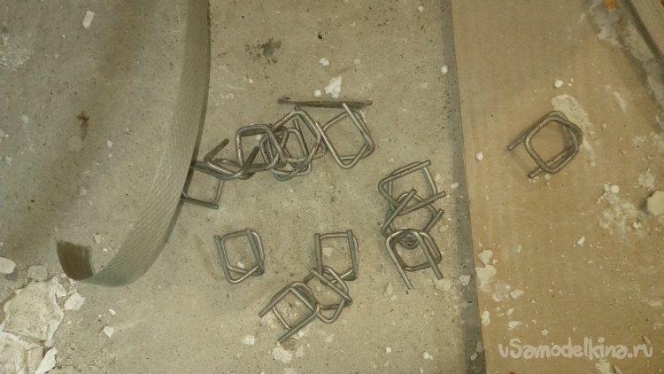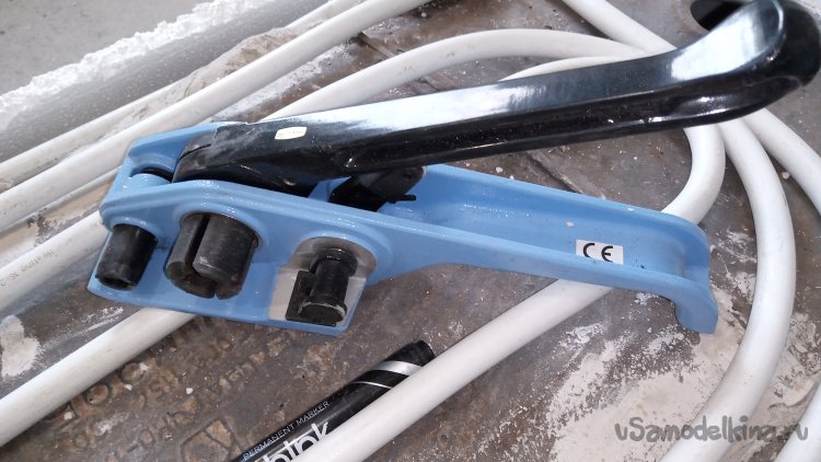 После того, как вся труба была обложена пенопластом, я плотно стянул ванну пластиковой тарной лентой, используя металлические пряжки и ручной натяжитель. Он позволяет стягивать ленту с таким усилием, что, к примеру, в деревянных поддонах с хрустом переламываются доски. Чтобы лента не прорезала пенопласт, я подкладывал под неё металлические прокладки, которые изготовил из каких-то кронштейнов, давно валяющихся у меня в "железе":
